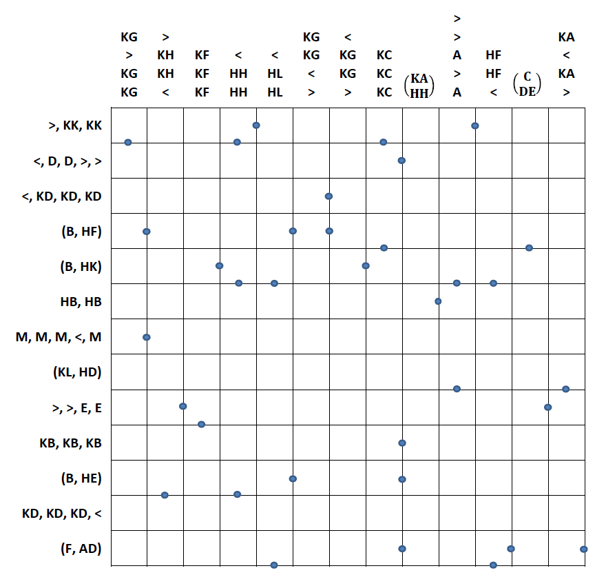 The agent in charge pushed a map across the table toward him, cleared his throat, and began to explain: "Now, Markus, as you surely are aware, the Centaurian people are mathematically obsessed with Minmax reasoning. They sent us a map with cryptified clues, which is to be interpreted as follows: It is an 'ordinary' Japanese Sums puzzle, but — Alpha Centauri being a sphere — with blocks that can continue at the other end of the row or column. The clues are cryptified in the regular manner, with each letter belonging to exactly one digit, and vice versa. Note, however, that wherever equal sums appear in a row or column, only these equal values are cryptified, and all the other sums were represented by greater-than and less-than symbols. These are notated in terms of the cryptified value that shares that row or column. If no equal sums appear, then — see the clues in parentheses — only the maximum and minimum sums were given. Be careful here, though, for it can definitely happen in such rows/columns that more than two blocks of digits can appear. The marked blue dots indicate wherever consecutive digits appear in neighboring cells. All such blue dots are given. There are three more things you must know: the blackened fields that separate the sums are never in orthogonally neighboring cells (a restriction that also applies across the outer edges), and further the first shown clue always refers to the leftmost or topmost block. (Note that this does not apply to the clues in brackets, where instead you see the minimum printed in front and the maximum in back.) And lastly, you are surely already aware that the Centaurians use a base 12 system, and all digits from one to eleven can show up in the grid, and can be (along with zero) cryptified. So that about does it! Have a pleasant journey!"