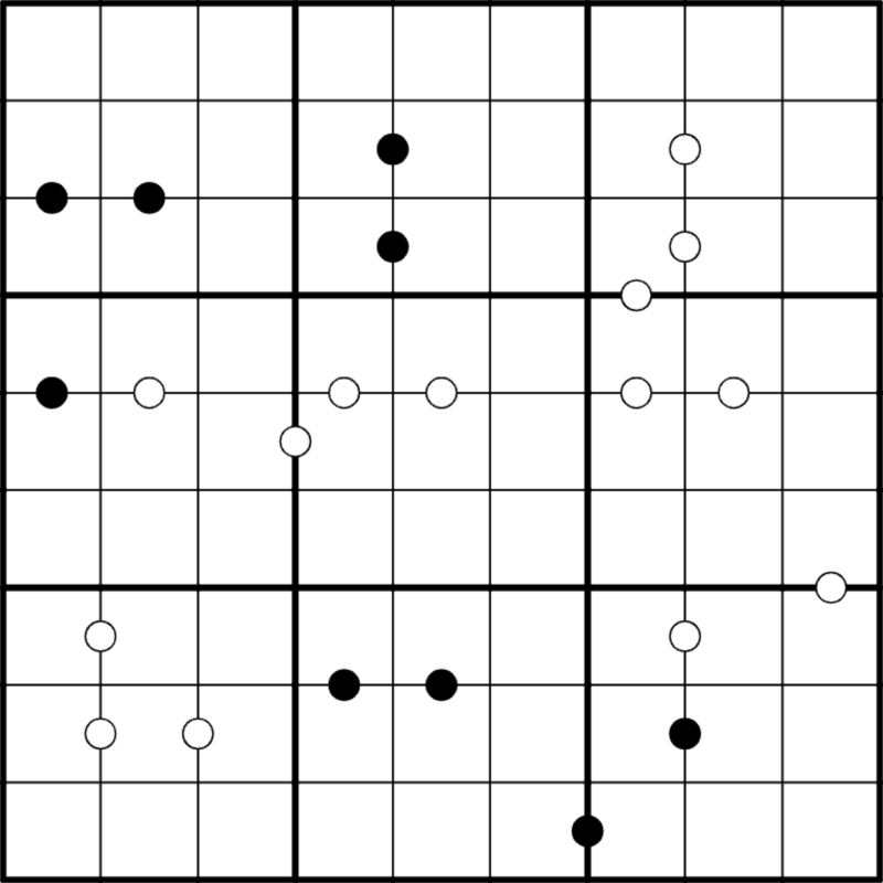 Normal Sudoku rules apply. Digits separated by a white dot are consecutive. Digits separated by a black dot must have a 1:2 ratio. Not all possible dots are necessarily given.