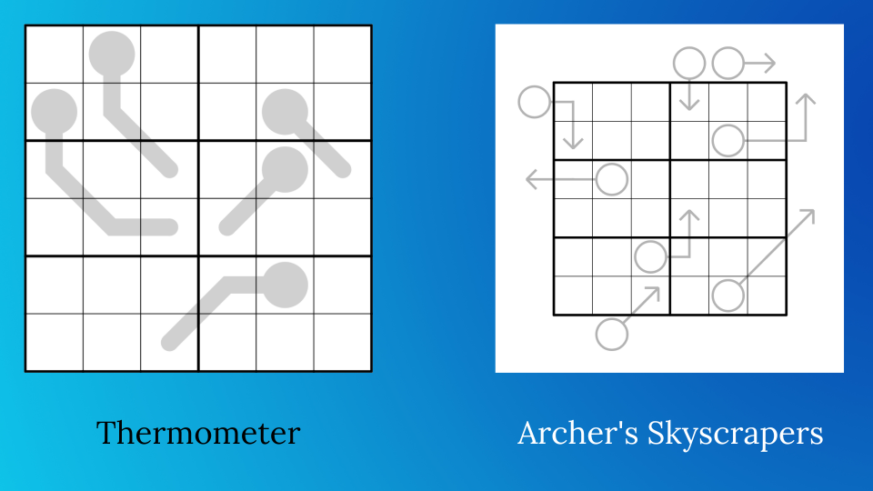 Thermometer, Arrow + Skyscrapers, Killer + Anti-king (non-touching), Multiplied Neighbors Sum, Before 1 - After 6 x Kropki and X-sum x Sandwich Sum.