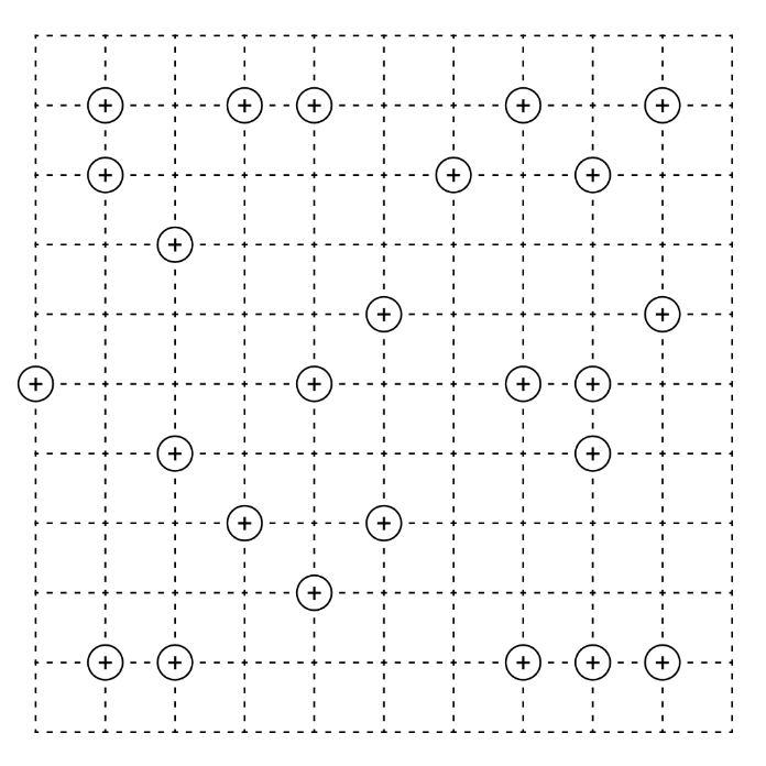 Rules: Draw a closed loop on the given edges, that doesn't touch or intersect itself. The loop has to pass through every + and ×. It has to turn left at every +, and right at every ×. The direction of the loop has to be found out by the solver.