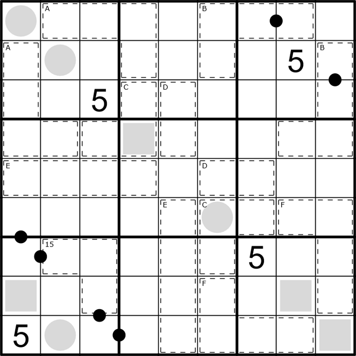• Modified killer: Digits in cages sum to the number in the top left corner. The letters A-F correspond to some numbers that need to be determined. Cages with the same sum must contain the same set of digits.