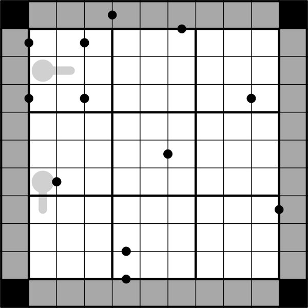 Ja, Ziffern können sich in den Zeilen/Spalten außerhalb des Rasters wiederholen (aber die negative Einschränkung gilt immer noch). Eine Folge wie 3-6-3 ist erlaubt, wenn sich zwischen den Zellen schwarze Punkte befinden und die letzte Ziffer außerhalb des Rasters liegt.