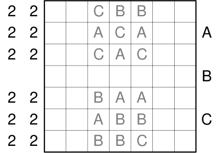 The letters from A to C are to be entered in the grid so that each letter occurs exactly once in each row and each column. All other cells are to be blackened. Letters outside the grid indicate the first seen letter in the corresponding row or column from the corresponding direction. The numbers outside the grid indicate the lengths of successive blocks of black cells in the correct order. There must be at least one letter cell between two blocks. Cells that already contain a letter may either be blacked out, or must contain the given letter.