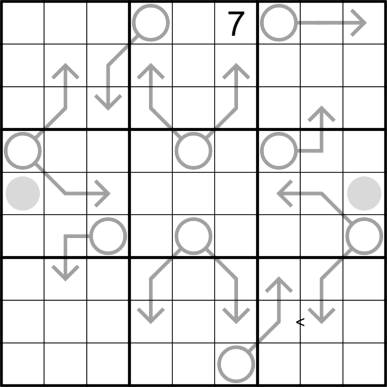 Qodec). Inspired by these, I set out to create an arrow sudoku that does not contain three-cell arrows. I also wanted to challenge myself to make a grid that is mostly symmetrical, which I found particularly difficult, but I'm very happy with the end product.