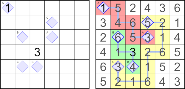 There are hidden lockout lines in the grid. Each pair of diamonds with the same letter must be connected by a line. Lines can only move orthogonally and cannot branch. Lines cannot cross themselves, other lines, or other diamonds.