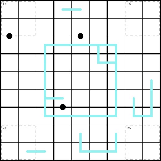 Normal Sudoku rules apply. Numbers on blue lines are consecutive with their neighbors on the line. Numbers may repeat on blue lines. Numbers with a black dot between them are in a ratio of 2:1. Not all possible lines and dots are given. Numbers in cages sum to the number in the top left corner of the cage.
