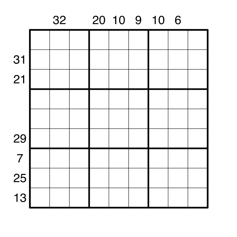 2) Normal sandwich rules apply. Clues outside the grid show the sum of the digits "sandwiched" between 1 and 9 in the corresponding row/column.