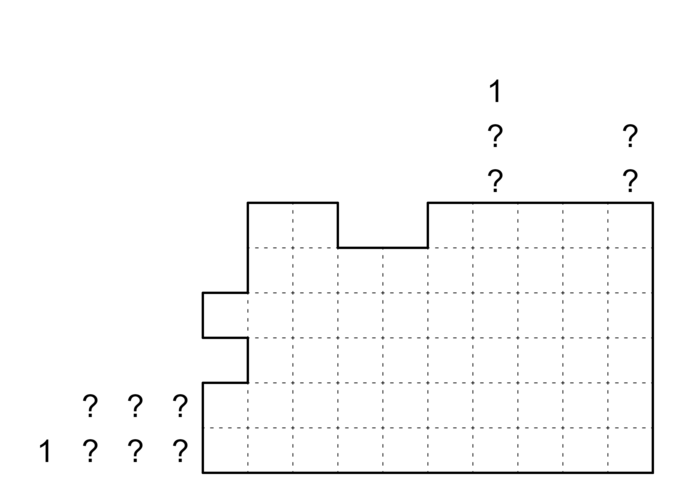 Divide the grid into 5-cell regions of orthogonally connected cells, without repeating a shape (including rotations and reflections as the same). Clues outside the grid give the lengths of the segments in that row or column in order of appearance (note that these are more similar to Roller Coaster clues than the puzzle linked above). "?" clues may be any number. Either all or no clues are given for each row and column.