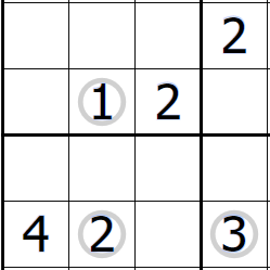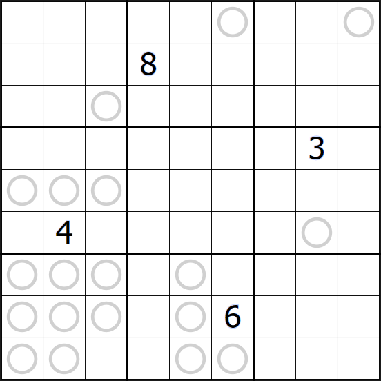 - Digit X in a circle signifies that every digit consecutive with X appears at least once exactly X cells above, below, left and/or right of it. Not all circles are necessarily given. (For example, if there were a 2 in the circle in R1C9, it would have to see 1 and 3 in cells R1C7 and R3C9.) (X-Consecutive)