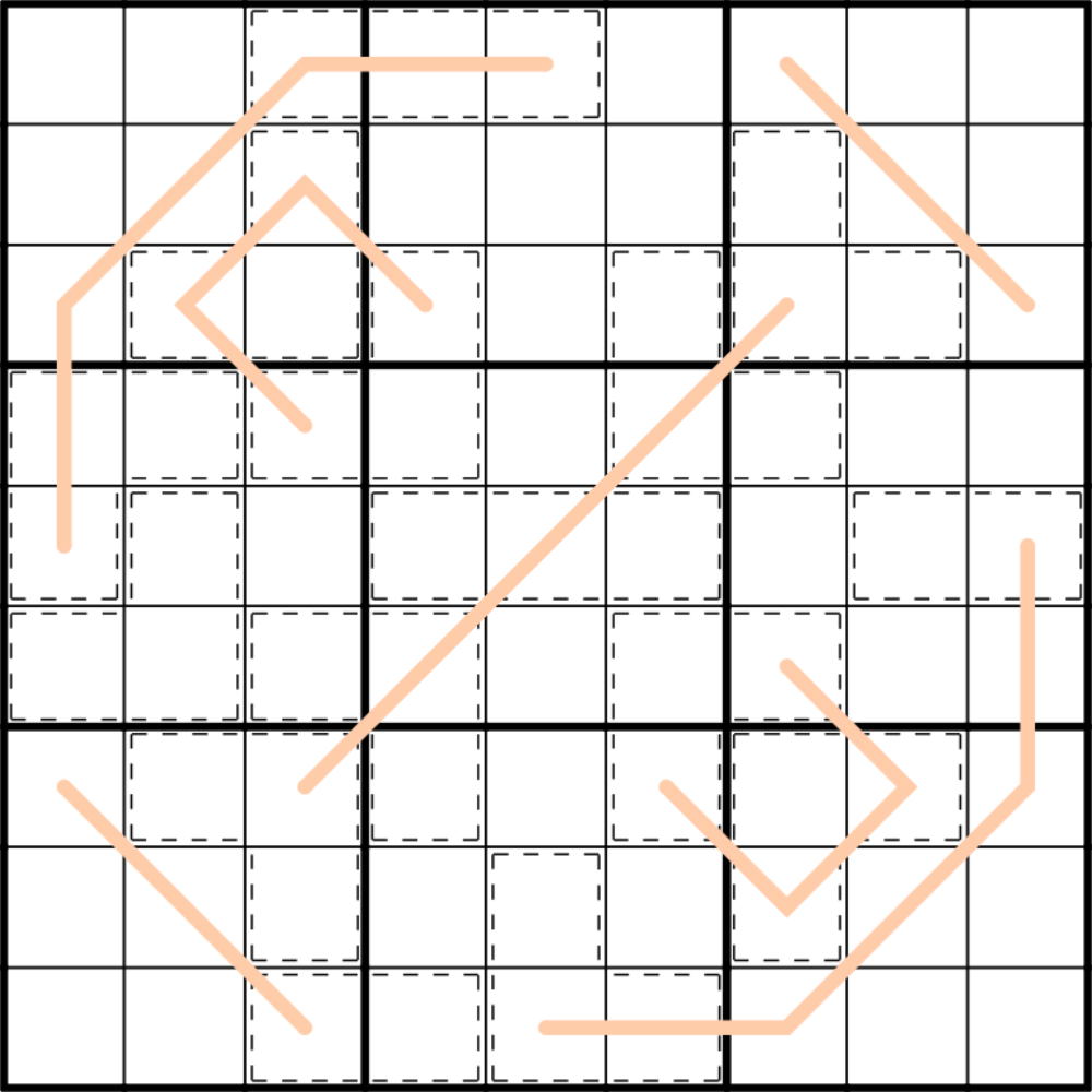 - Entropic lines: Any set of three sequential cells along an entropic line must contain a low (1,2,3), middle (4,5,6), and high (7,8,9) digit. Digits may repeat on a line if allowed by other rules.