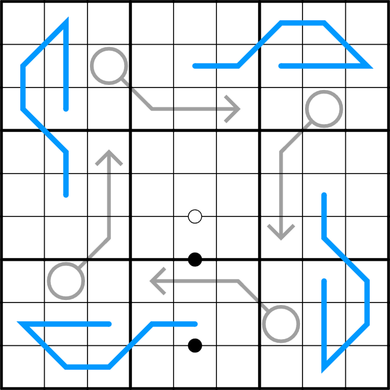 - Kropki Dots - White dots connect consecutive digits. Black dots connect digits with a 2:1 ratio. Not all dots are given.