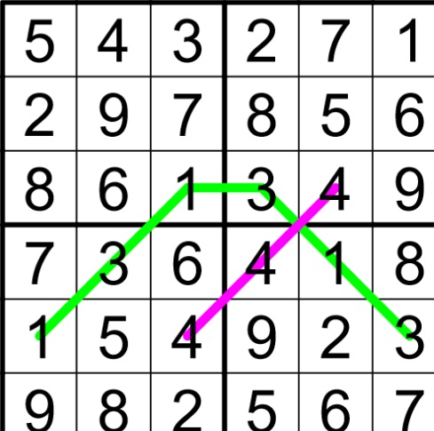 Normal Sudoku rules apply. Every distinctly colored 'mode' line contains a unique set of digits adding up to 12. The sets themselves consist of digit groups that are repeated at least once, fully and in the exact order along their lines (i.e. a six-digit 'mode' reading 13-13-13 would be valid, 13-13-31 would not). In the grid, two orthogonally adjacent digits may NEVER add up to 12.