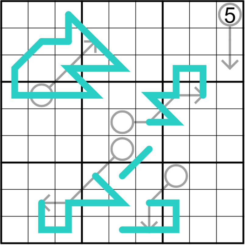 Modular Lines: Every three adjacent digits along the teal line must contain a complete set of digits that have different remainder modulo 3. ie: one from{1,4,7} one from {2,5,8} one from {3,6,9}. If a line have only two cells, then they must be from different subsets. Digits may repeat on the line.