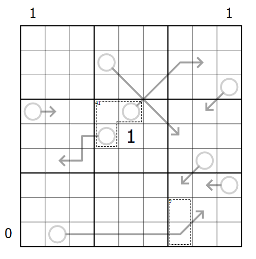 4. Digits outside the grid show the sum of the values sandwiched between the 1 and the 9 in the column or row.