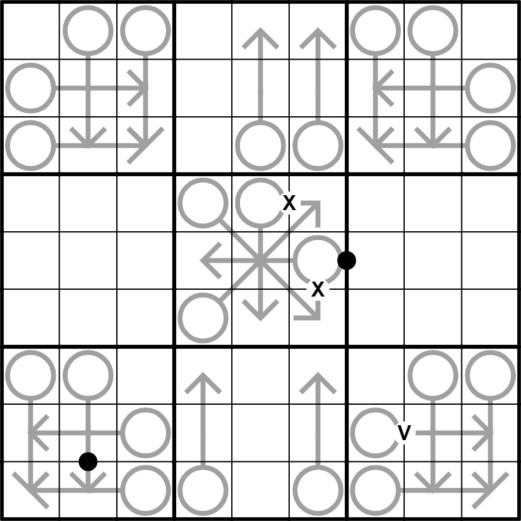 Normal Sudoku rules apply. Numbers on arrows sum to the number in that arrow's circle. All arrows are length 2 and straight. Numbers with a black dot between them are in a ratio of 2:1. Numbers with an X between them sum to 10. Numbers with a V between them sum to 5. Not all possible dots, X and V are given. Warning: More difficult than most of my puzzles.