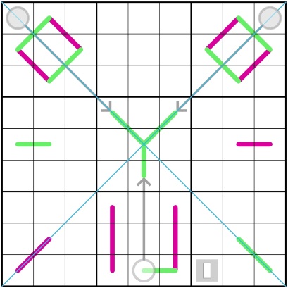 - Diagonals : the 2 main diagonals (marked in blue) must each contain the digits 1 to 9 once each.