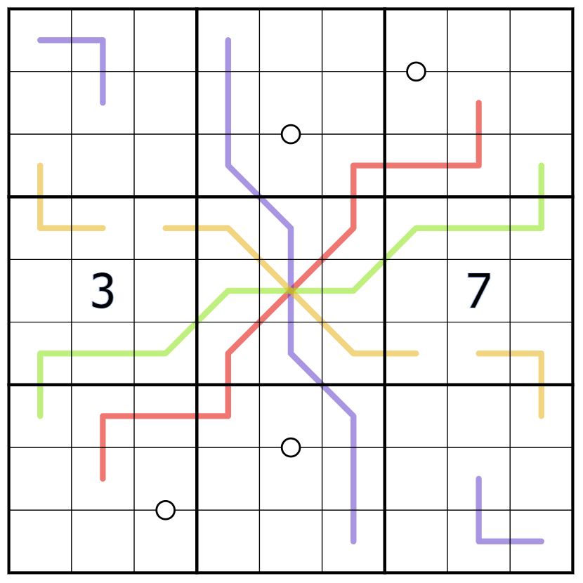 - Digits in cells connected by a white dot are consecutive. Not all dots are necessarily given. There is no negative constraint.