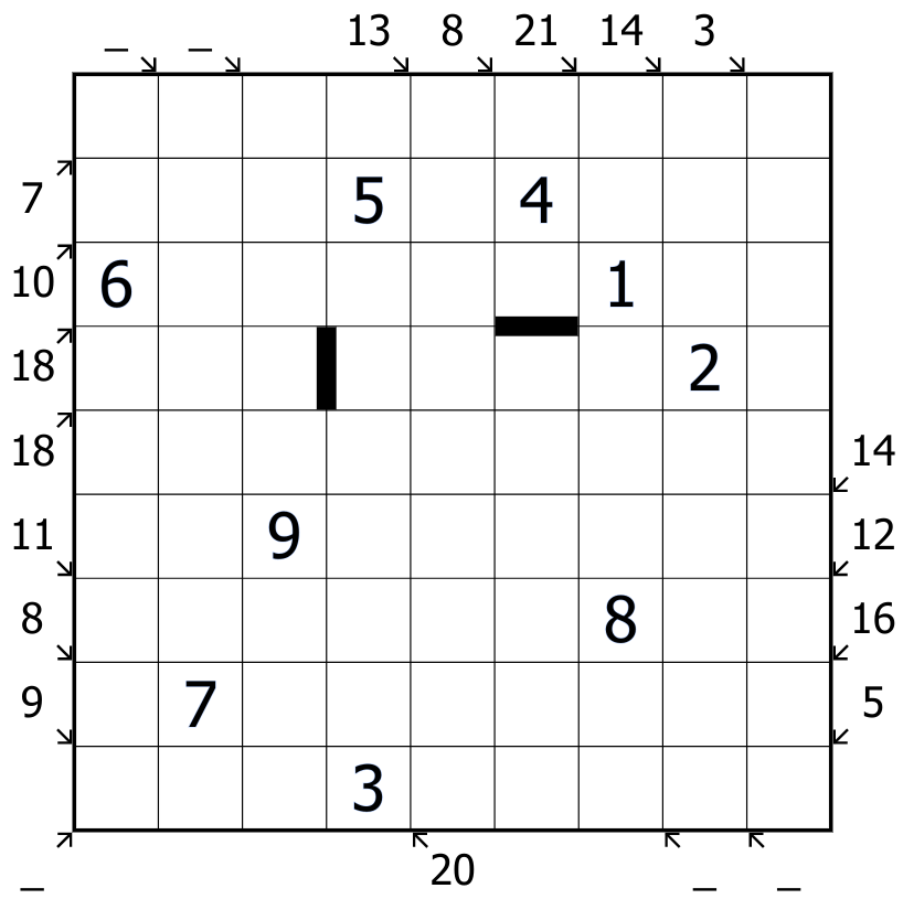 Little Killer rules: A clue outside the grid shows the sum of the digits along the indicated diagonal (if it is given). Digits can repeat along this diagonal if allowed by the other rules.