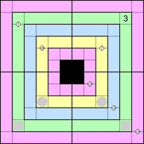 • Place a digit from 1-6 in each cell such that no digit repeats in a row, column, or any quadrant (marked by bold lines) of any grid made by two adjacent rings.