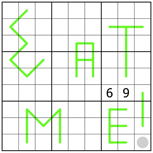 In addition, exactly five rows contain the digits 6 and 9 consecutively from left to right, forming a "69". One of these five 69 pairs is given in row 6. The solver must find the other four hidden 69s.