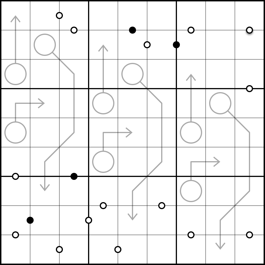 Normal sudoku rules apply. Additionaly, standard arrow and kropki rules apply