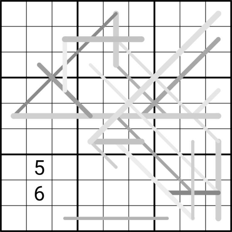Lines are Between Lines, Modular Lines, or Palindromes. The identity of each line must be deduced (given line colors are purely cosmetic). Lines are always straight and never branch in this puzzle, but they do touch or cross other lines. A line may not touch or cross another line of the same type.