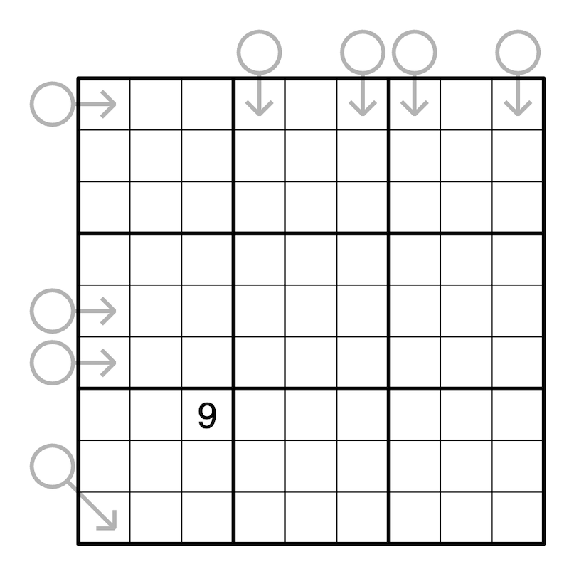 • Clues outside the grid indicate the sum of the digits between the 1 and 9 in that row/column.