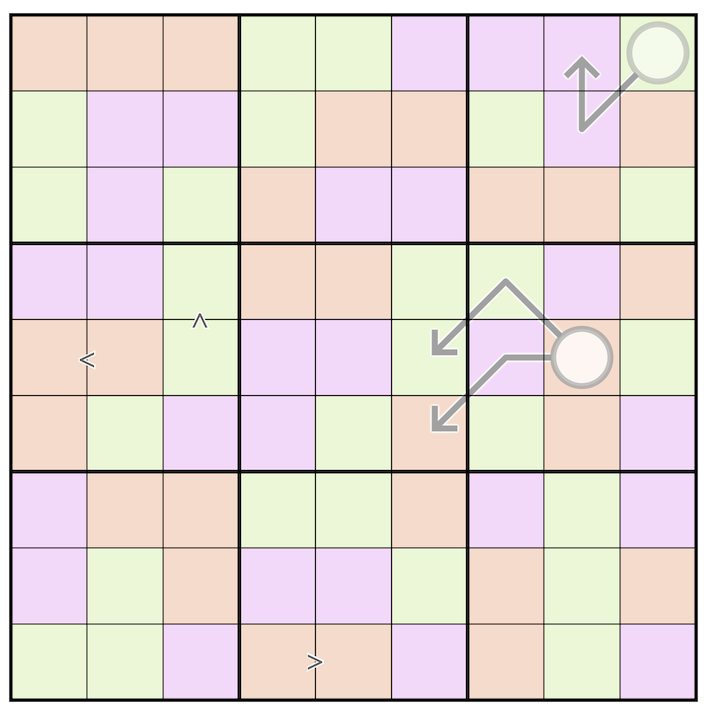 Rules: Normal Sudoku rules apply. There are 3 different colors in the grid. Each color is assigned to 1 of 3 categories: low (123), middle (456), and high (789) digit. Also this puzzle follows a unique chess rule. All 81 digits on the board must be a chess move away from at least one other occurrence of itself. For example: if the number 5 was placed somewhere on the board, it would have to be able reach at least one other 5 via a knights move or queen move (since every move in chess can be completed by these two pieces) The digits along each arrow must sum to the digit in the circled cell. Digits may repeat along an arrow if permitted by other rules. Cells on either side of the inequality symbol must have values that abide by the indicated relationship. This is the URL for the CTC App, enjoy!!!! https://tinyurl.com/CTC-Easyas123
