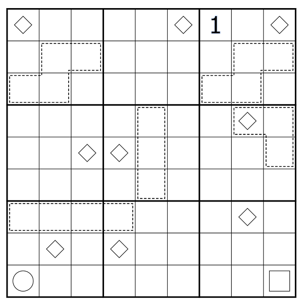 - There is a path of orthogonally connected cells that visits each of the 9 boxes exactly once, starting at the circle and ending at the square.
