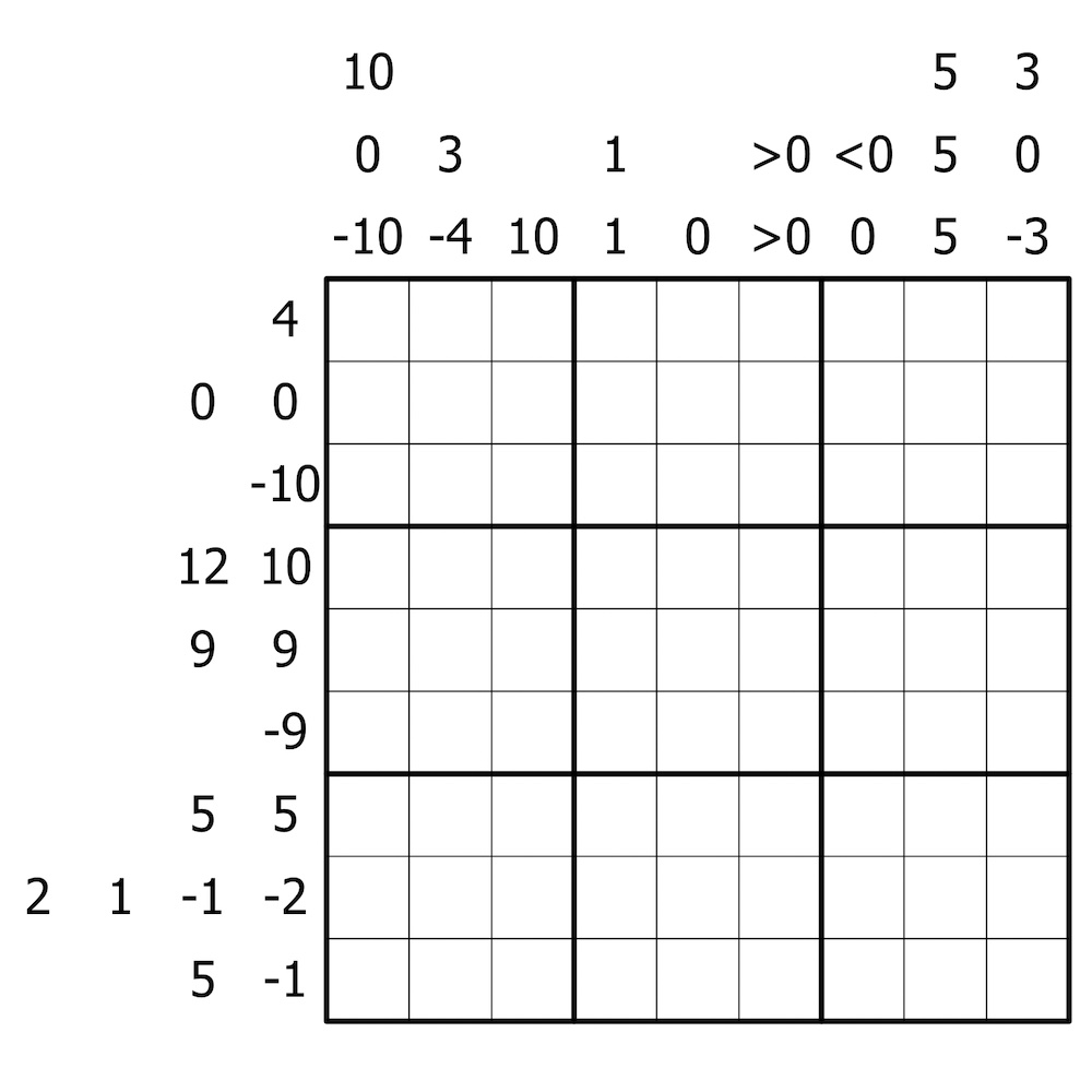 Play it on Penpa if you'd prefer. Answer check on digits only, but not positive/negatives.