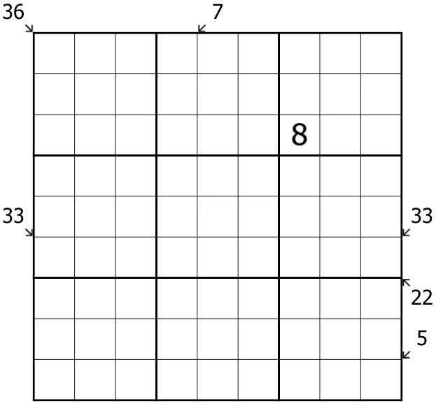 The clues outside the grid all have two meanings: they give the sum of the diagonals indicated by the arrows, AND they give the sum of digits "sandwiched" between the numbers 1 and 9 in the clue's row or column. (The latter doesn't apply to the clue in the top left corner as it doesn't see any row or column directly.)