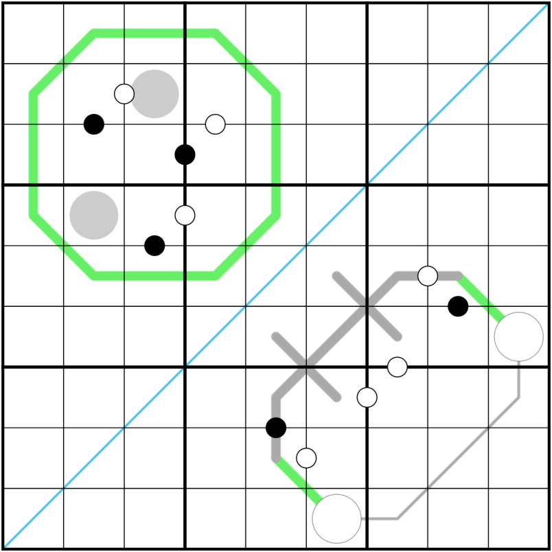 Digits along each German Whisper Line (green) must differ by at least five [5].