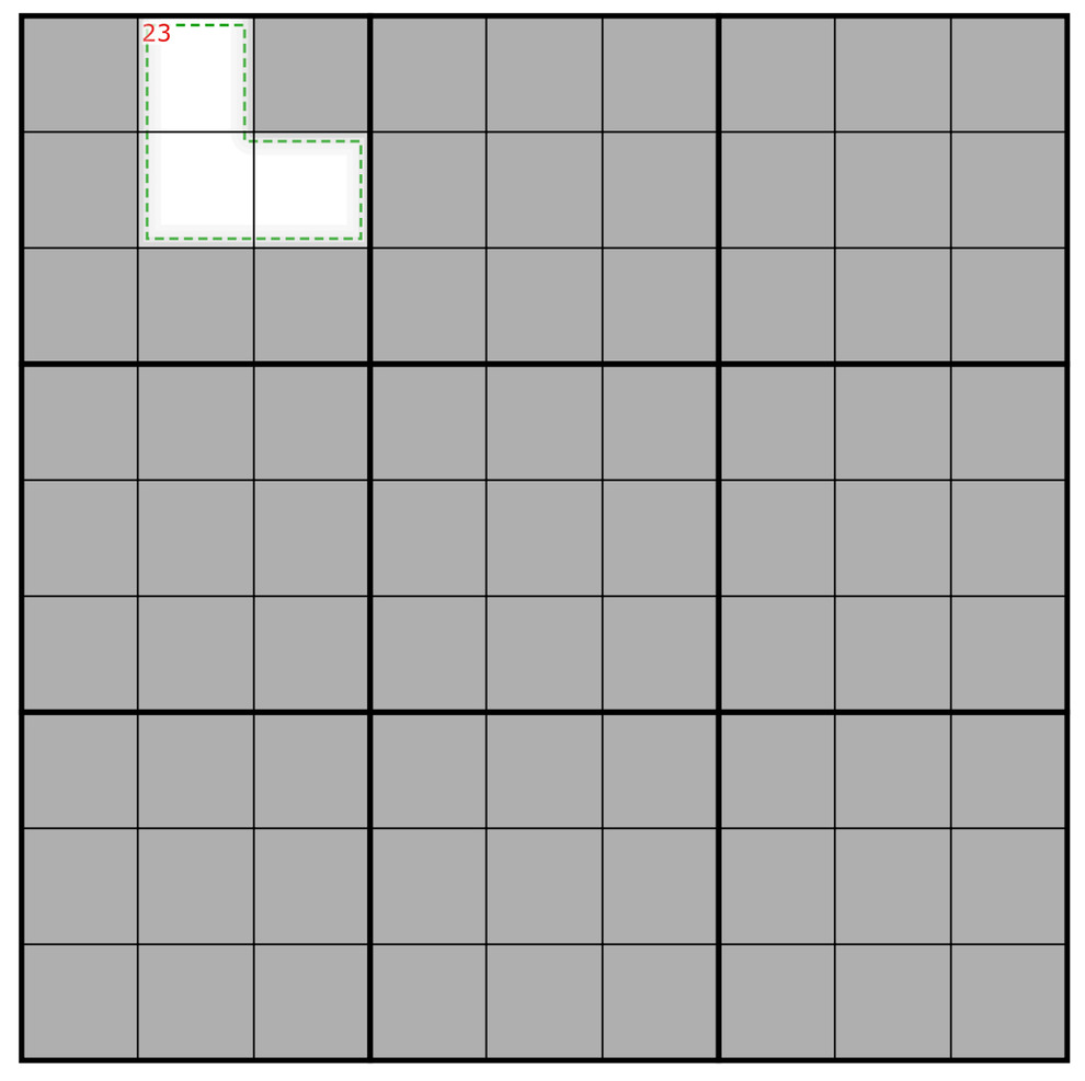 Digits in a dashed cage must sum to the value in the top left corner of the cage (if given). Digits may not repeat within their own cage.