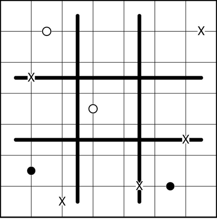 - Digits separated by an X sum to 10. Digits separated by a white dot are consecutive. Digits separated by a black dot are in a 1 to 2 ratio.