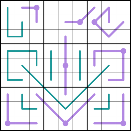 • Any set of three sequential cells along a teal modular line contains one digit from (1,4,7), (2,5,8), and (3,6,9).
