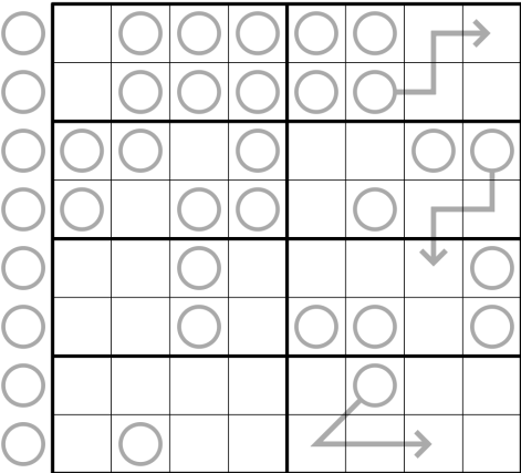Solution code: Row 1 followed by row 8 (including the circles outside the grid of those rows).