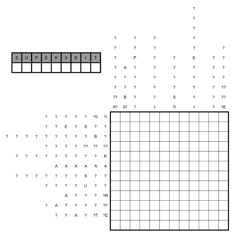 Chaos: While I was setting the puzzle I dropped it and all the clues were scrambled. I didn't have time to fix them all, so I just put all 3 clue types together in ascending order. For any row / column, either all clues or no clues are provided. I also cryptified the digits 1-9 with the 9 letters of your nickname. Some digits (including 0) I replaced with ?s, where a ? is single digit and a ?? is a double digit clue with no 0 in the ten's digit, so hope you have fun!