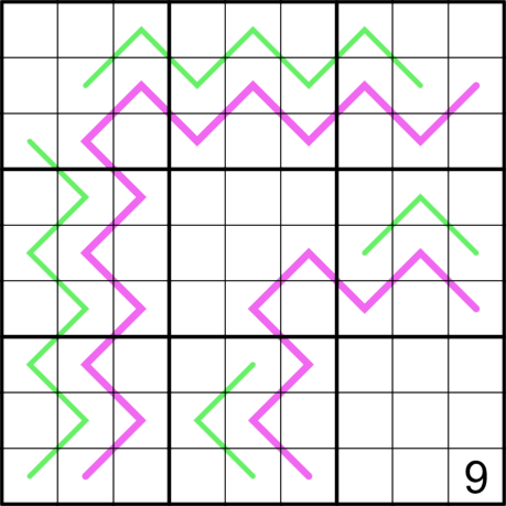 This a very hard puzzle. It is designed to be difficult. Not my normal style, but I wanted to do something different. This one won’t have overall beautiful flow, although it will at various stages. My target audience are those people who like to chip away at a puzzle until it falls apart. It will probably require AICs of various lengths and types. It will also require integrating knowledge of the fairly new Run On Renban rule with the German Whispers.