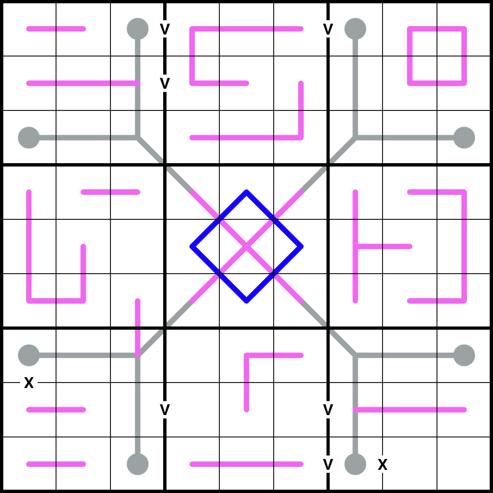 Cells joined by an X or V must sum to 10(X) or 5(V).