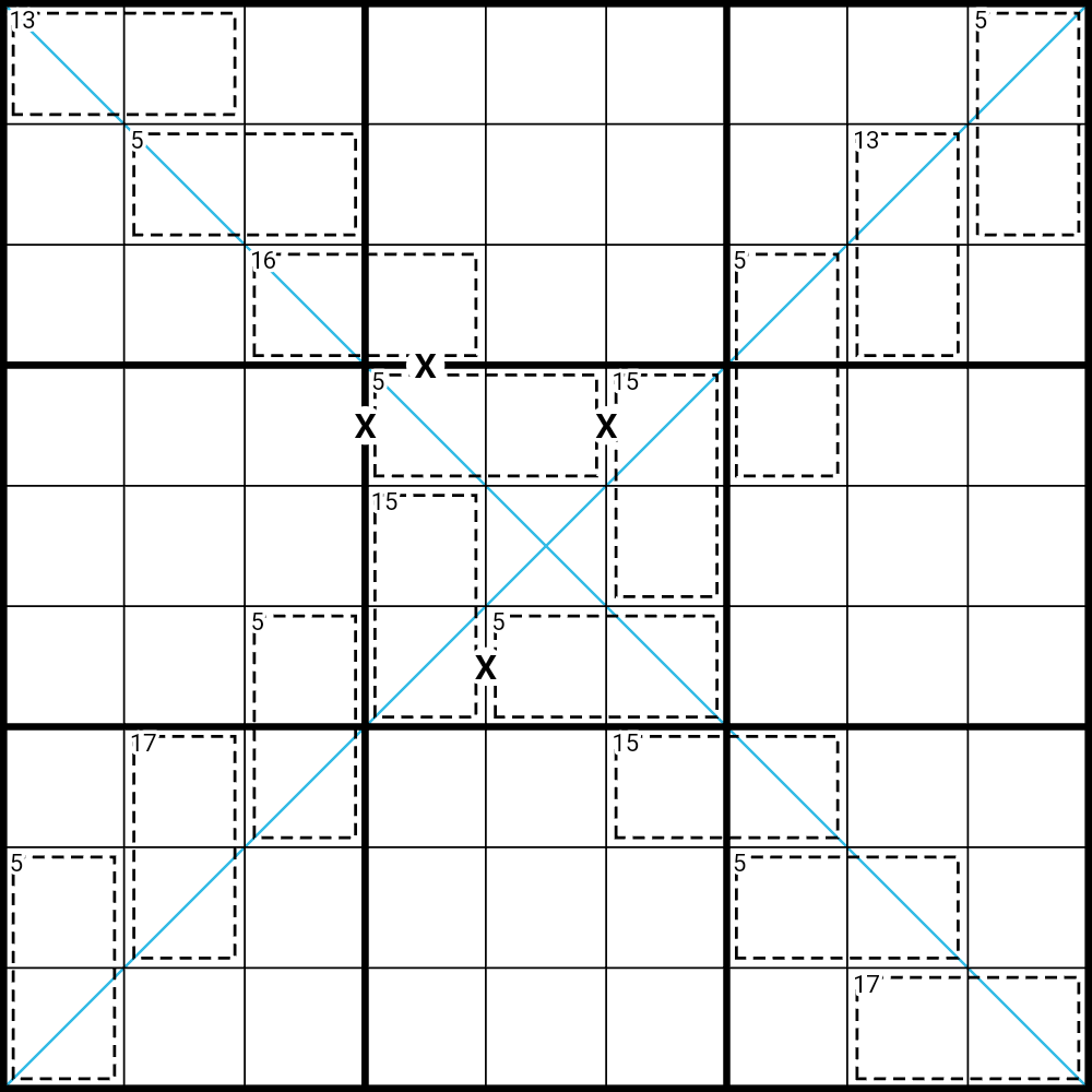 - XV-pairs: Cells joined by an X or V must sum to 10(X) or 5(V).