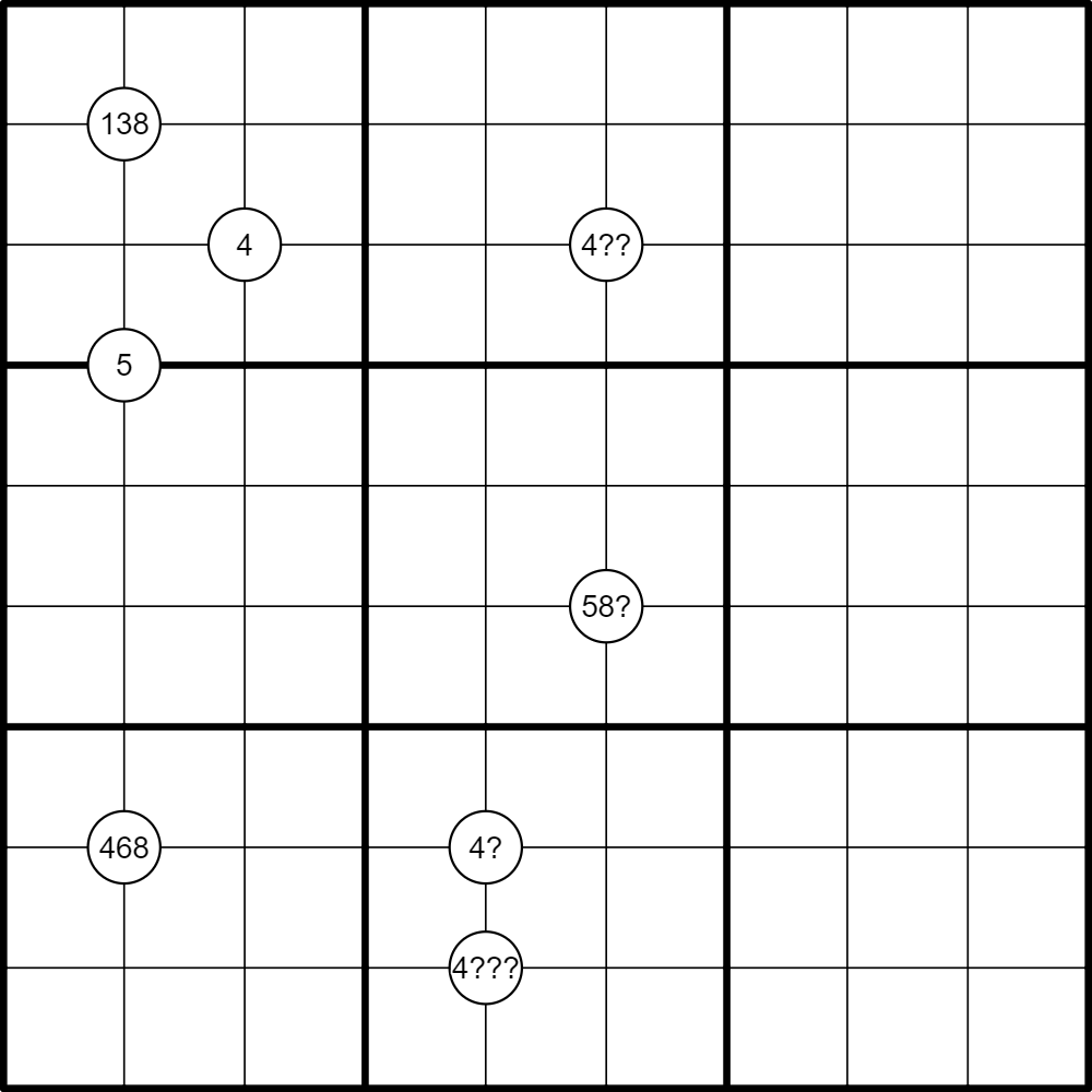Clues in a circle indicate the values of all shaded digits in the 4 cells surrounding the clue. Each question mark represents a single digit, which must be unique within that circle.