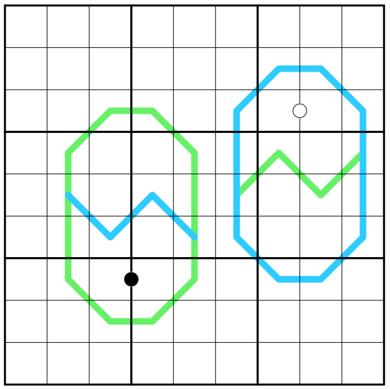 Normal Sudoku rules apply. Digits a King's move (in chess) apart must be different. Adjacent digits on a green line must differ by at least 5. On blue lines digits sum to the same value in every box. Black dot digits are in a 1:2 ratio, white dot digits are consecutive. Not all dots are necessarily given.