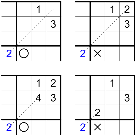 The diagram below is an example of some possible scenarios when you want to fill in the blue 2, where ○ represents that you can fill in, and × represents that you cannot fill in. Please note that during the problem-solving process, you need to pay attention to all four diagonal directions. You can use a pencil to mark which cells can only be filled with a certain digit, even if that digit cannot be filled in the current situation.