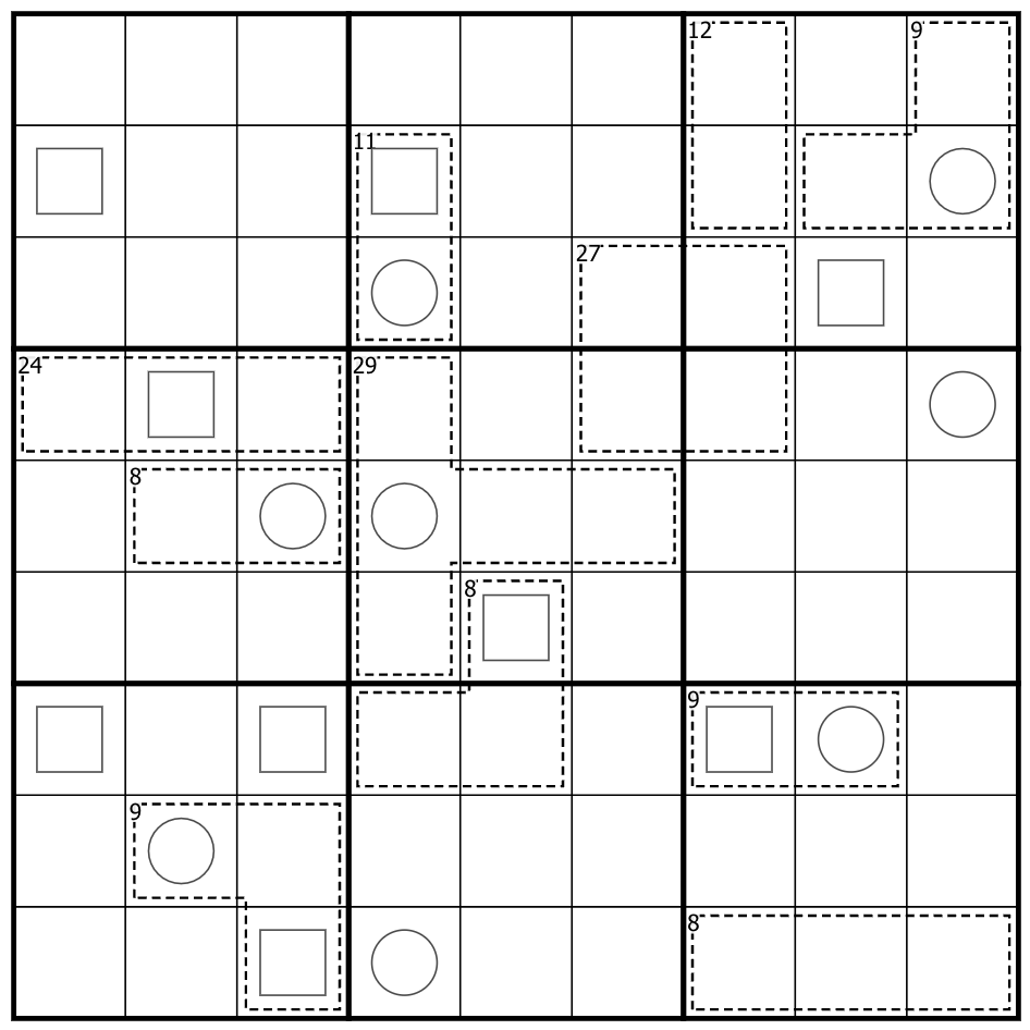 Killer-Cages: Digits in cages cannot repeat and must sum to the value shown in the upper left corner of the cage.