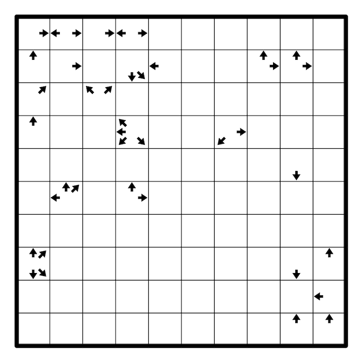 A number placed in a cell with an arrow or arrows in a region on Red Team indicates the total number of cells seen in the indicated directions combined, where region borders or the edge of the grid obstruct vision. The clue cell itself is not included in the count. A number placed in a cell with an arrow or arrows in a region on Blue Team indicates the total number of region borders that appear in the indicated directions combined.