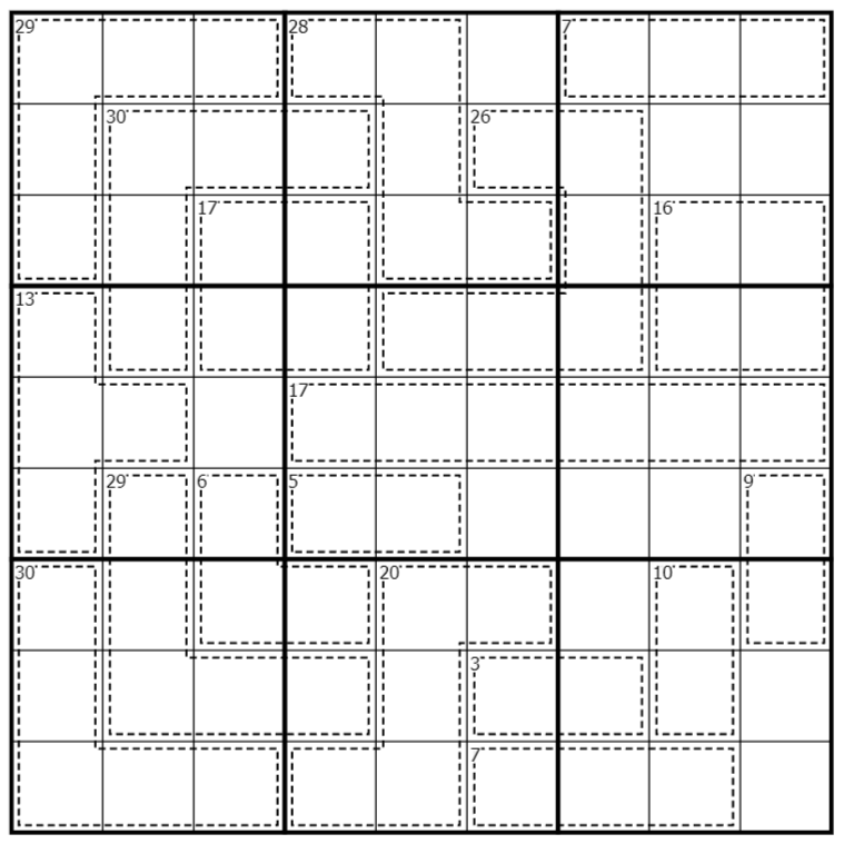Two cells in each box, row, and column have a value of 0 for the purposes of cage totals. Digits may not repeat in a cage regardless of their value.