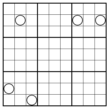 • Circles mark every instance of a cell which is unshaded and orthogonally adjacent to exactly one other unshaded cell.