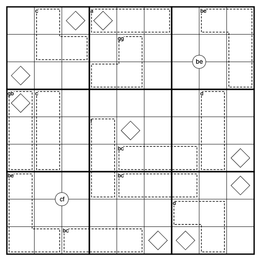 - Killer cages: Digits in a cage must sum to the clue in the top left. (Two letter clues are read as standard two-digit numbers from left to right, i.e. if a represents 1 and b represents 2 the combination ab is a 12 clue.)