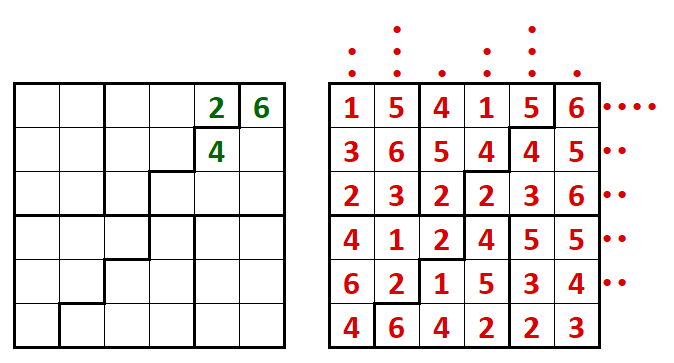 This sudoku variation follows the standard rules: each digit from 1 to 6 must appear exactly once in each row, column, and outlined region, with no repetition. In the diagram on the right, the dots above and to the right indicate how many cells in the corresponding column or row will contain the same digit in the solved grid on the left.