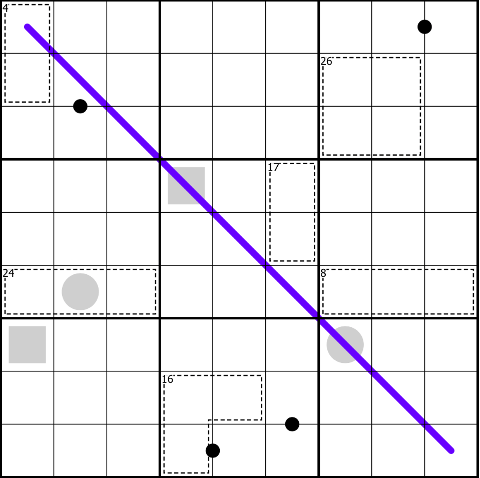 Digits in a cell possessing a circle must be odd. Digits in a cell possessing a square must be even. Digits in a killer cage cannot repeat and together must sum to the value in the upper left-hand corner of the cage. Cells separated by a black dot have a ratio of 1:2 (in no particular order).